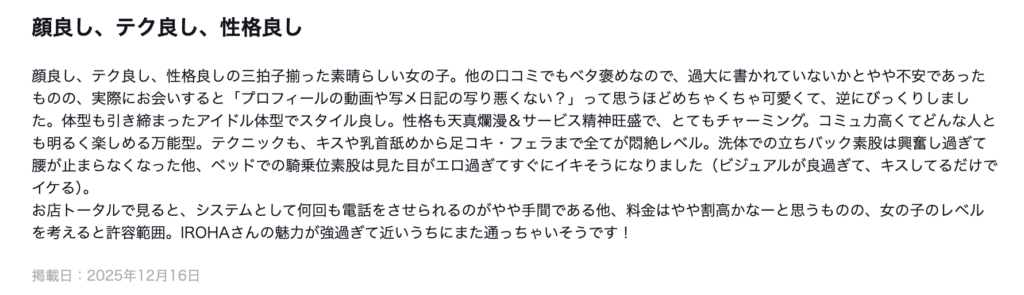写メ日記でも口コミでも感じるサービスの丁寧さと献身性!読んでいるだけで勃起してしまうプレイテクニックにも言及が🤤