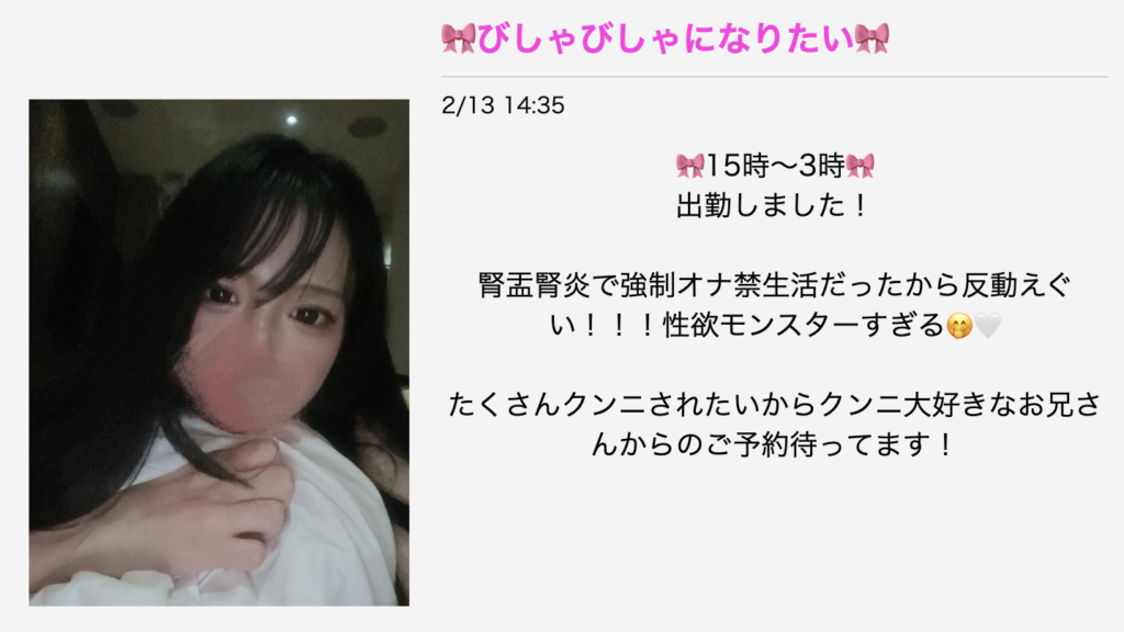本指名5位にランクインしている彼女のルックスや性格、プレイ内容、さらには気になる本番の有無についてはブロマガを読んでみてください!